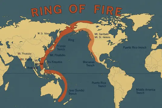 The Ring of Fire is a horseshoe-shaped zone around the edges of the Pacific Ocean. Moreover, It is home to about 75% of the world’s active volcanoes and experiences around 90% of the world’s earthquakes. It’s formed due to multiple convergent plate boundaries, where oceanic plates subduct beneath continental or other oceanic plates.
