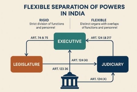 India doesn’t have a rigid separation of powers like the USA or a total fusion of powers like the UK. Instead, it employs a “functional” or “flexible” separation model, where the Legislature, Executive, and Judiciary are distinct in theory but interdependent in practice.
